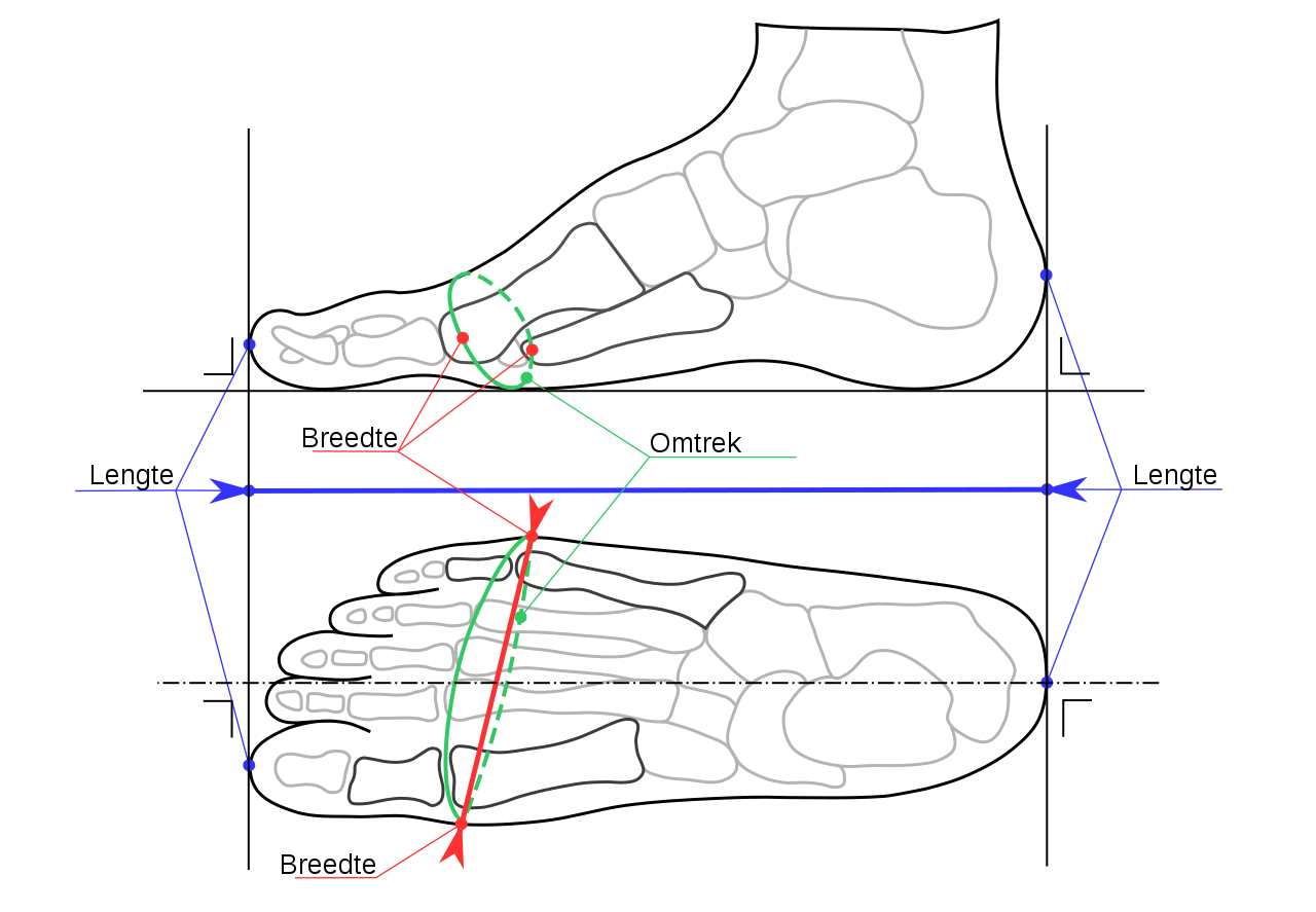 Om je maat te vinden, plaats je een meetlint en een stuk papier op een vlak oppervlak tegen een muur. Met je hiel op ongeveer 1 mm afstand van de muur, ga je op het meetlint staan, rol je je gewicht langzaam naar voren op de voorvoet terwijl je je hiel stevig op de grond houdt. Kijk naar beneden en meet de afstand vanaf de muur tot je langste teen. Noteer de lengte. Laat je voet nog steeds op z’n plaats, gebruik een rechte rand in een verticale positie en plaats deze tegen het breedste deel van beide zijden van de voet. Meet de breedte over het breedste deel van je voet en noteer het aantal in millimeters. Herhaal deze stap voor beide voeten.
