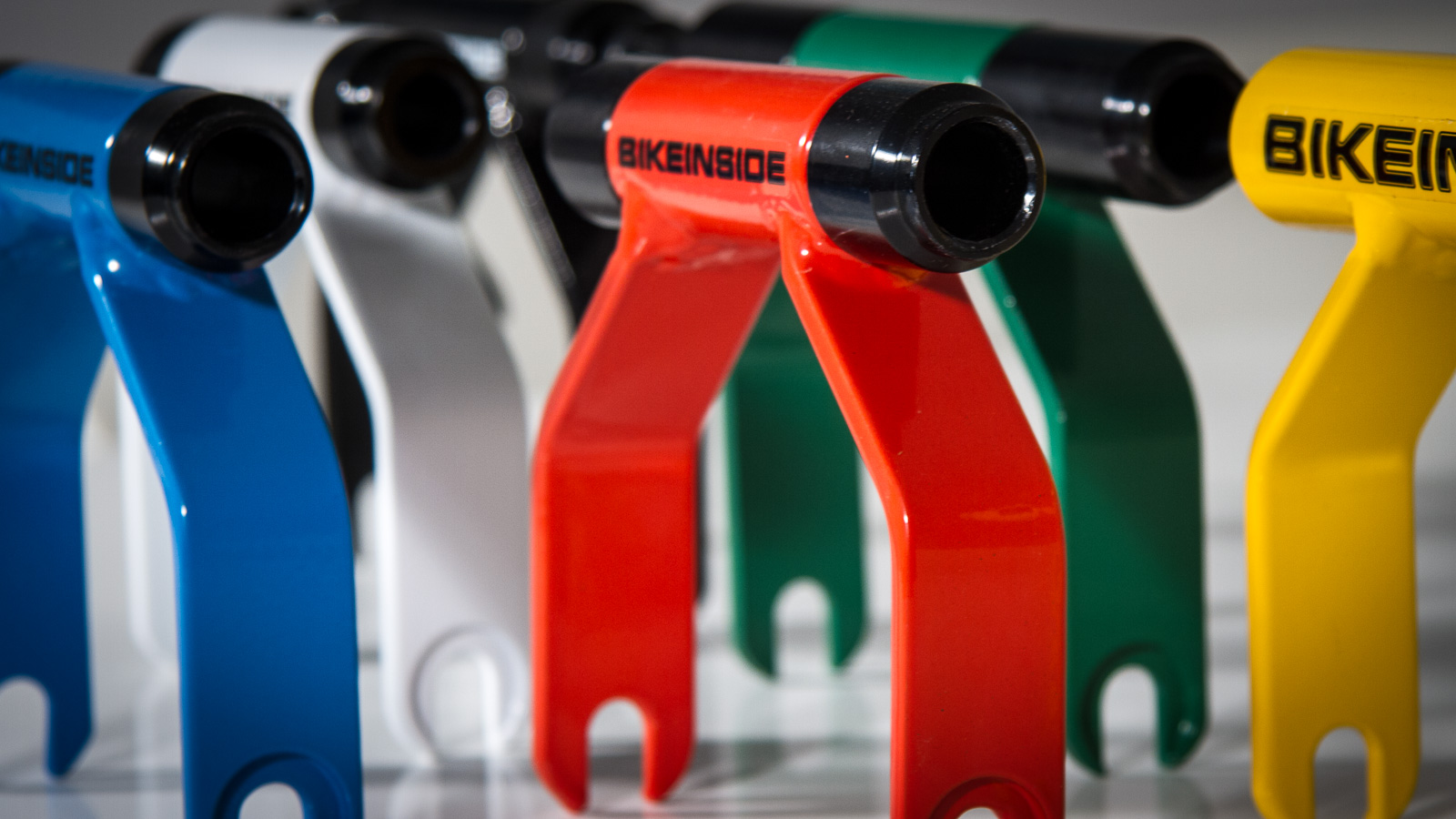 De Bikeinside Extender bestaat uit een basiselement van gepoedercoat staal en CNC gefreesde aluminium hulzen. De 20/110mm verlenger is gemaakt van gepoedercoat staal. In de 9/100mm extender wordt een hoogwaardige snelspanner meegeleverd.