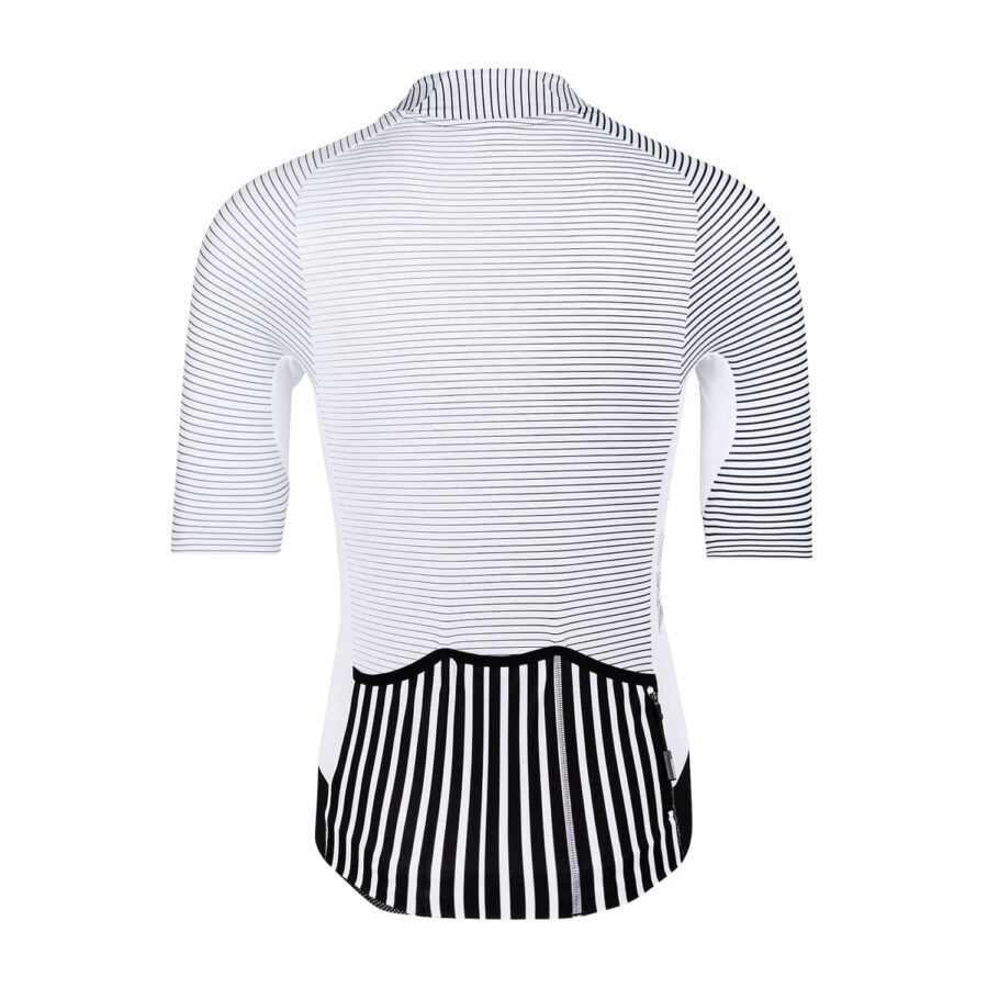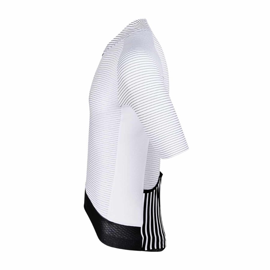 De strak gesneden mouwen met geïntegreerde grijpers zorgen voor een geleidelijke compressie. De mesh powerband zorgt ervoor dat je jersey tijdens de hele rit perfect op zijn plaats blijft, ook als je in een aerodynamische positie rijdt. Dankzij de geperforeerde zijpanelen blijf je fris. Verder geeft de 4-way stretch je extra bewegingsvrijheid.