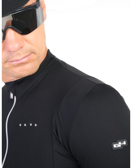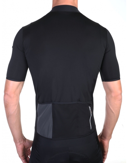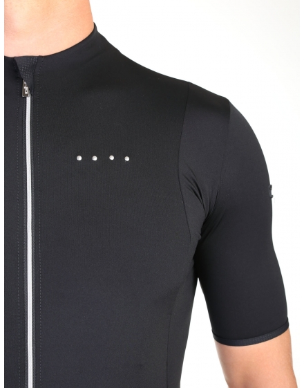 Neotex™-materiaal voor optimale lichaamstemperatuur-regulering, ingezette luxe kraag, warm weer jersey, hoge vochtoverdracht, UV50+ zonbeschermingsfactor, aerodynamische snit, extreem licht van gewicht, zilveren ritsen, knopen en afwerkingen, 3 waterdichte achterzakken waarvan één reflecterend plus een extra veiligheidszak met ritssluiting.