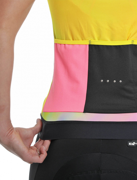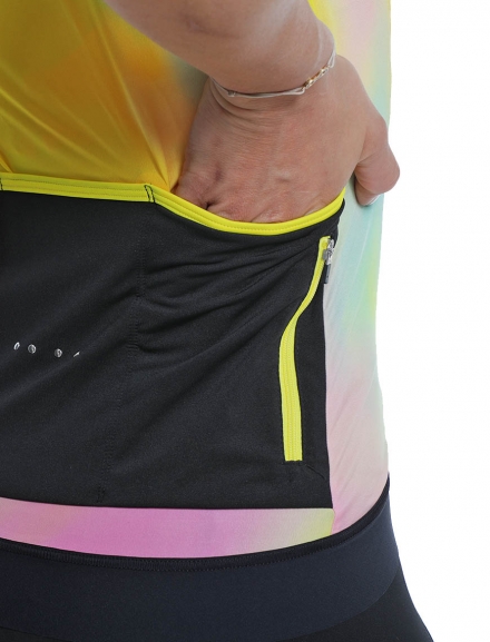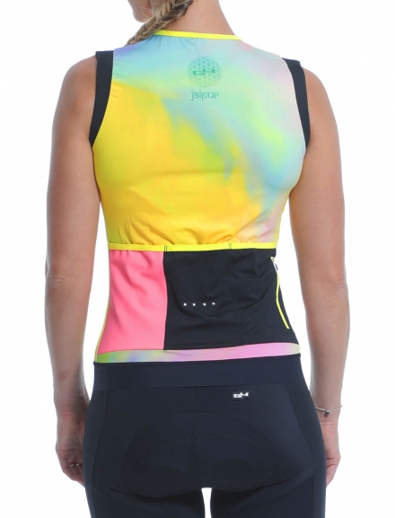 De JAIPUR zomercollectie mouwloos dames fietsshirt gebruikt het lichtste Skin Lycra®-materiaal in de G4-collectie. Deze explosie in kleur past zich perfect aan de vrouwelijke morfologie aan dankzij de ultrazachte stretchstof en de elastische stretchband van 4 cm die de heupen effectief beschermt met siliconenstippen. De JAIPUR kleurrijke wielertrui is gemaakt van Skin Lycra®-stof en zorgt voor ademend vermogen en absorptie van transpiratievocht om te voldoen aan de eisen van je inspanningen op de fiets, terwijl je silhouet elegant wordt benadrukt. Het ontwerp met 3 versterkte zakken aan de achterkant, die een reflecterende zak delen en 2 andere Cargo-zakken sublimeert een gele zak met ritssluiting om kleine waardevolle spullen te dragen.