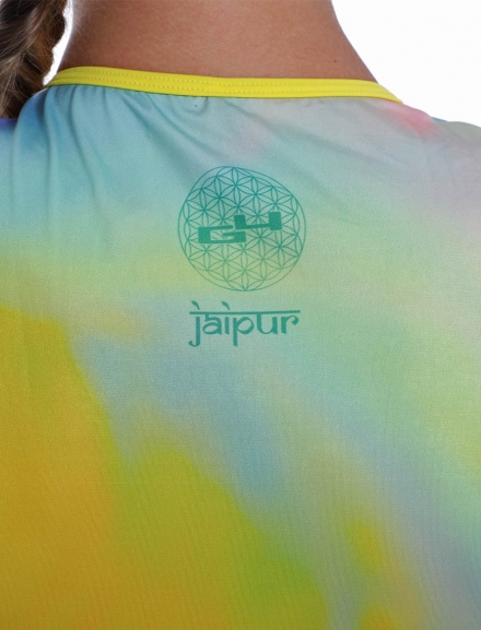 Fietsshirt Jaipur: omdat we leven om gelukkig te zijn! Deze JAIPUR-collectie is een eerbetoon aan kleuren, aan de levensvreugde en aan de geneugten die eruit voortvloeien! Een echte knipoog naar India, land van contrasten en festiviteiten. Wees zichtbaar op de weg! Gezien worden is essentieel om rustig te rijden. Het geel domineert deze trui en roze, pastelblauwe en groene tinten vullen het geel harmonieus aan.