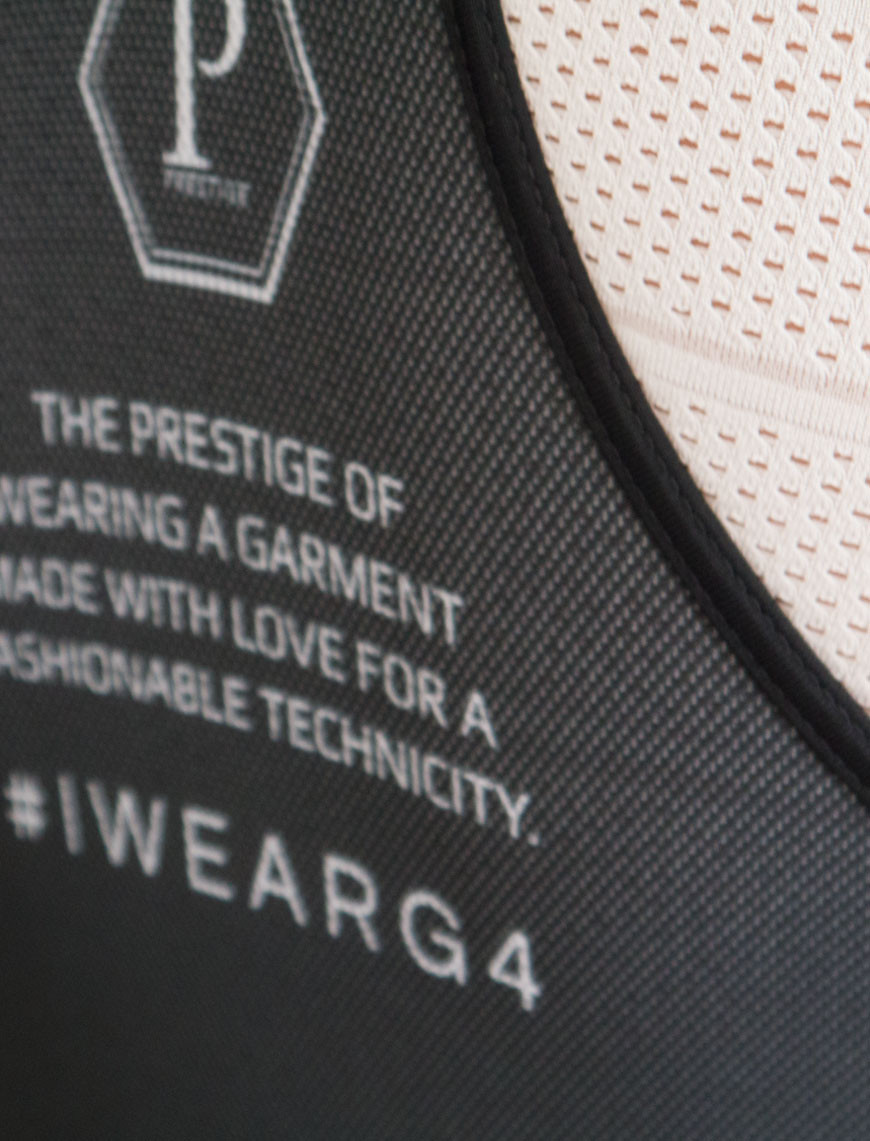 De zwarte elastische band van 7 cm herinnert aan de buste van de Prestige-jersey.
