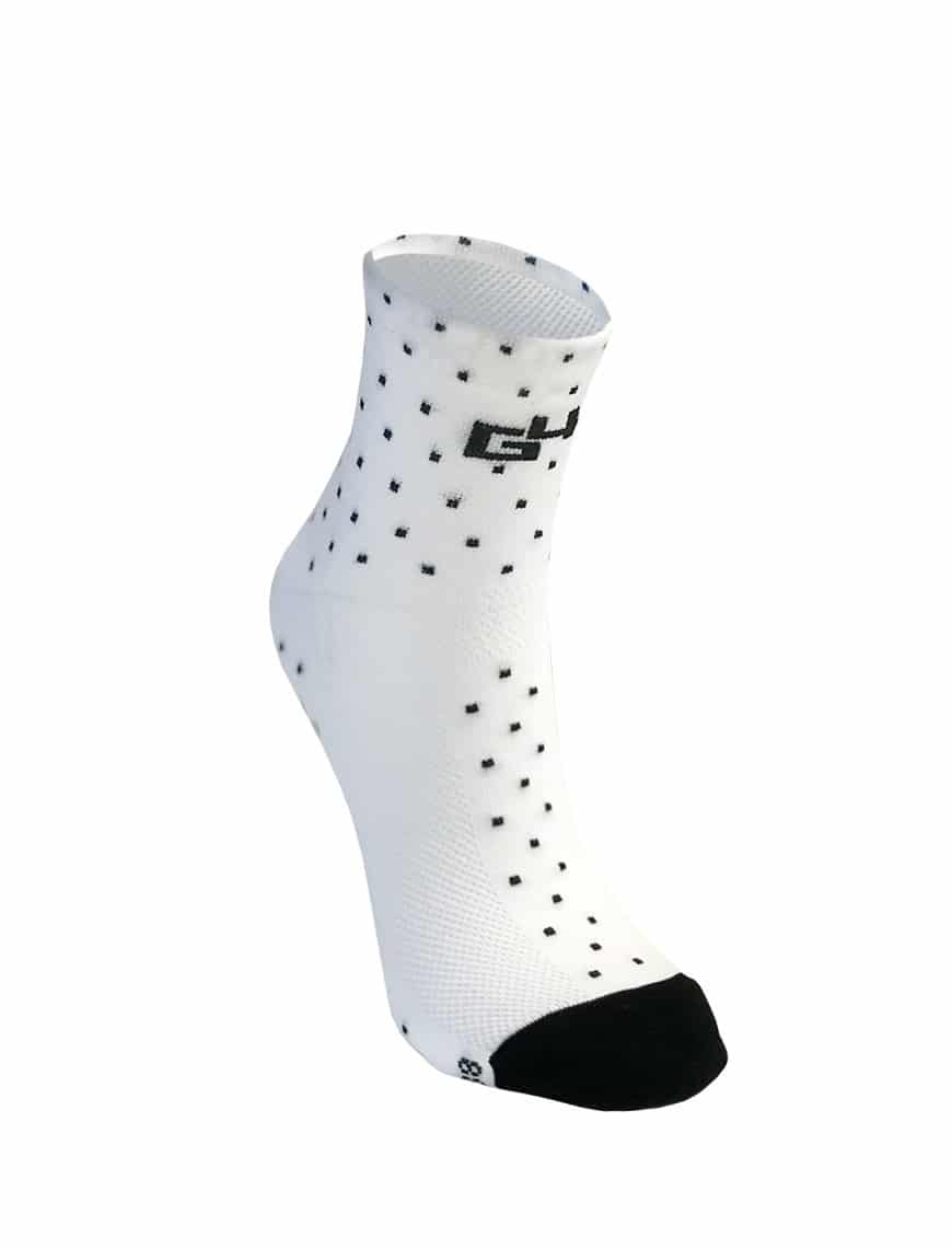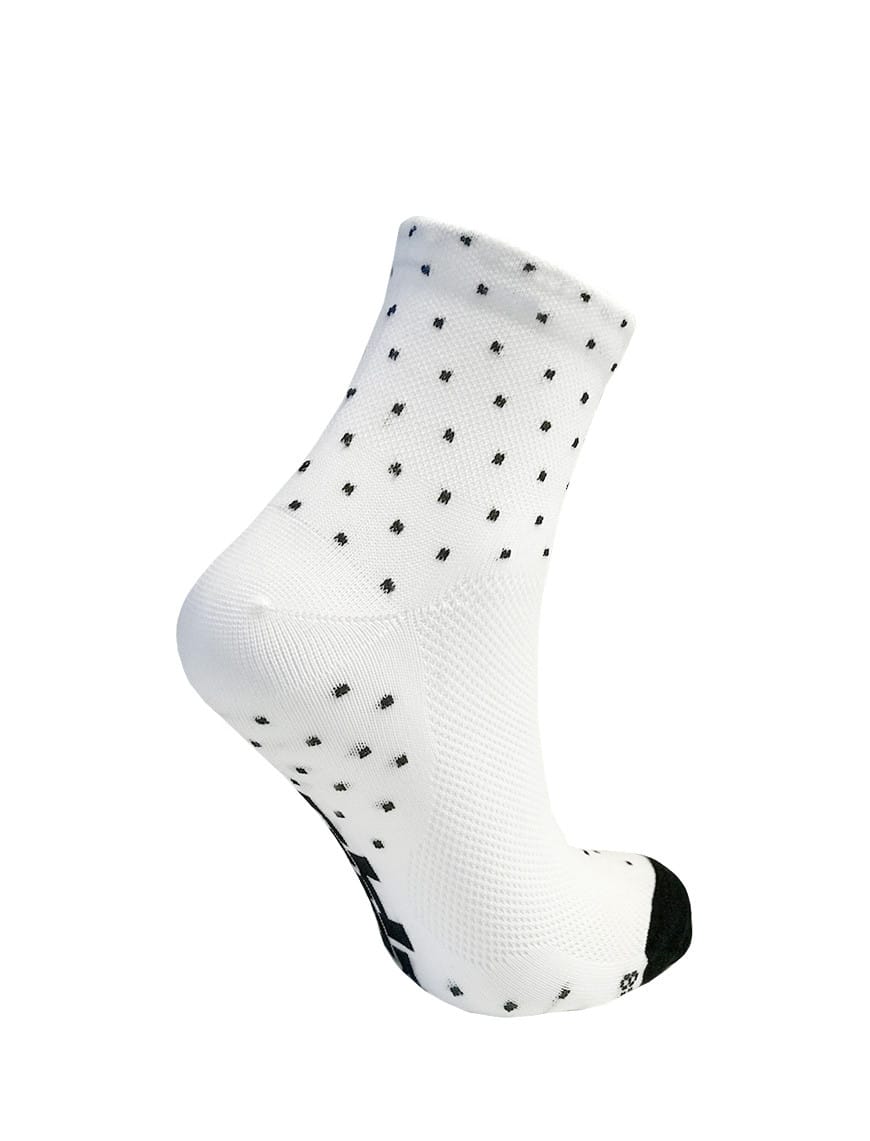 De witte fietssokken met zwarte stippen zijn gemaakt om te passen bij de stijl van menig wielertenue. Geniet van het dragen van deze pure en minimalistische fietssokken die zijn gemaakt om te passen bij menig outfit.