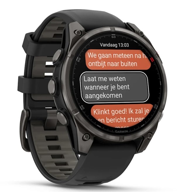 Via een satelliet- of LTE-verbinding kunnen berichten rechtstreeks vanaf je smartwatch worden gedeeld met andere gebruikers van de Garmin Messenger app. De app synchroniseert automatisch met je contactpersonen wanneer je smartwatch is gekoppeld met je smartphone.