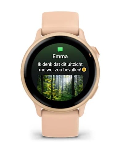 Ontvang e-mails, sms-berichten en waarschuwingen op je sporthorloge wanneer deze is gekoppeld met je iPhone of Android smartphone. Met een Android smartphone kun je sms-berichten beantwoorden met het schermtoetsenbord en foto’s bekijken die direct naar je zijn verzonden vanaf het scherm van je sporthorloge.