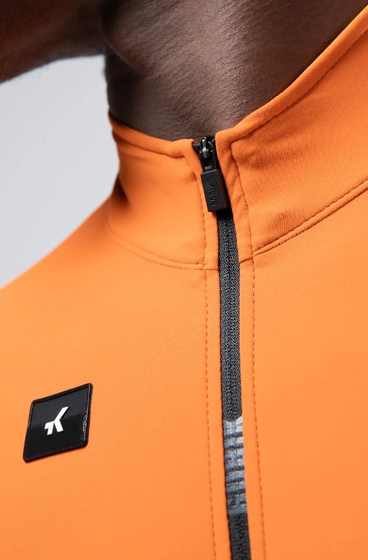- De zichtbare rits zorgt voor een dynamische visuele uitstraling en is voorzien van een gezeefdrukt logo. De stof is perfect elastisch om plooien op de buik te voorkomen, wat de esthetiek verbetert en zorgt voor een betere pasvorm en aerodynamica.