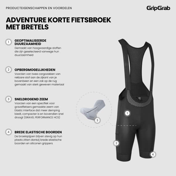 De fietsbroek voor heren GripGrab Adventure met bretels is gemaakt van hoogwaardige polyamide met stretch. Deze leveren langdurig goede prestaties. En voelt daarbij ook heel prettig aan.Er zitten twee, bijna niet zichtbare, zakken aan de zijkant van het bovenbeen en een zak op de rug. Zodat je voldoende ruimte hebt voor gelletjes, repen, gereedschap en andere spullen die je onderweg nodig hebt