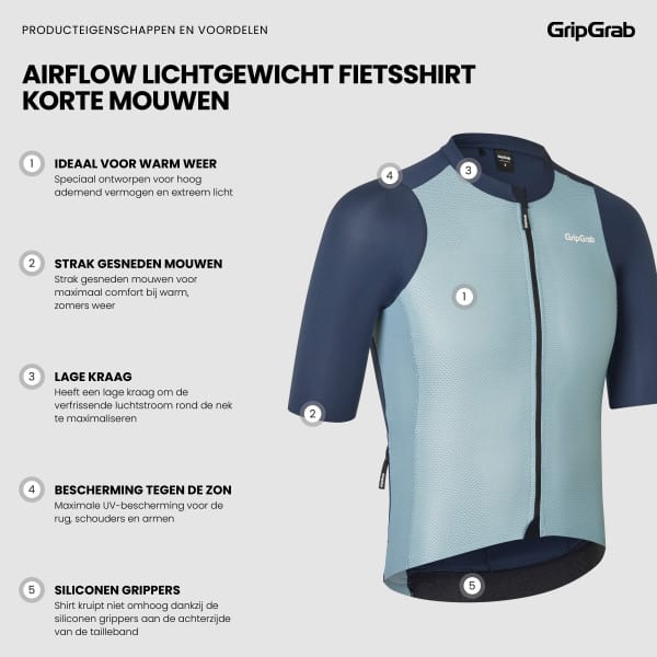 Het GripGrab lichtgewicht Airflow fietsshirt met korte mouwen heeft mouwen met een strakke ‘raw-cut’ afwerking voor maximaal comfort en een lage kraag die de verkoeling rond de hals stimuleert. Er zit een elastische gripper aan de achterzijde van de tailleband en een gelamineerde afwerking aan de voorkant, om opkruipen te voorkomen. Het fietsshirt heeft drie achterzakken op de rug, waarvan een zak met ritssluiting. Zo kan je alle spullen meenemen die je nodig hebt tijdens je rit. Alle logo’s op het shirt zijn reflecterend, uiteraard voor een betere zichtbaarheid.