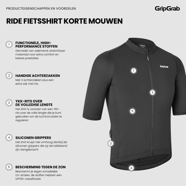 De GripGrab Ride Short Sleeve Jersey is gemaakt van ademend materiaal met een uitgebalanceerde hoeveelheid stretch. Het is ontworpen om comfort en prestaties te leveren terwijl het je beschermt tegen schadelijke UV-stralen. Met een rits die over de volledige lengte open kan kun je de luchtcirculatie naar wens regelen, afhankelijk van je fietsomstandigheden. Het shirt heeft drie achterzakken op de rug en een extra zakje met ritssluiting, waarin je van alles mee kunt nemen. Zoals gereedschap en snacks. De siliconen grippers op de tailleband zorgen ervoor dat het shirt op zijn plaats blijft zitten en de reflecterende logo’s bieden een betere zichtbaarheid in slechte lichtomstandigheden.
