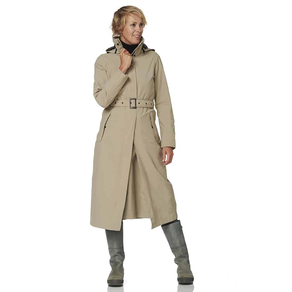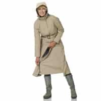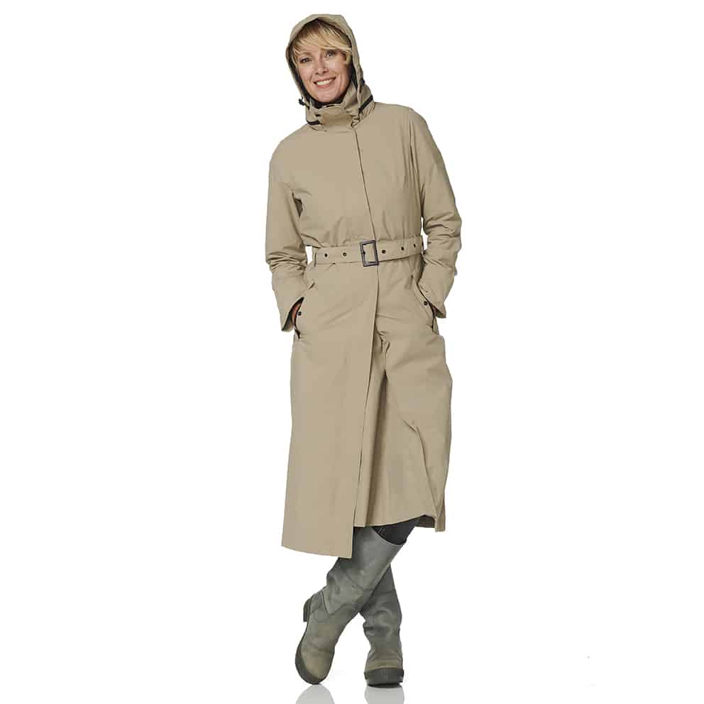 De beige lange Montreal regenjas voor dames is het pronkstuk van HappyRainyDays. Deze beige lange Montreal regenjas voor dames met afneembare capuchon van HappyRainyDays rijkt tot aan de enkels. Het bijzondere aan deze jas is dat hij een extra tussenstuk heeft speciaal voor op de fiets. Met deze jas heb je geen regenbroek nodig om droog te blijven op de fiets. Door de flap, die ook naar binnen geritst kan worden, heb je extra bewegingsruimte en blijven je benen droog tijdens een fietstocht of wandeling. De buitenzijde van de jas is van gecoate nylon waardoor de jas niet alleen 100% waterdicht is maar ook ademend. Alle naden zijn getaped. De zakken hebben een ritssluiting en drukknoop. De binnenzijde is van 100% katoen voor het draagcomfort. 10000 mm water-winddicht en 10000 mvp ademend. Kortom een unieke jas met een uitstekende pasvorm.