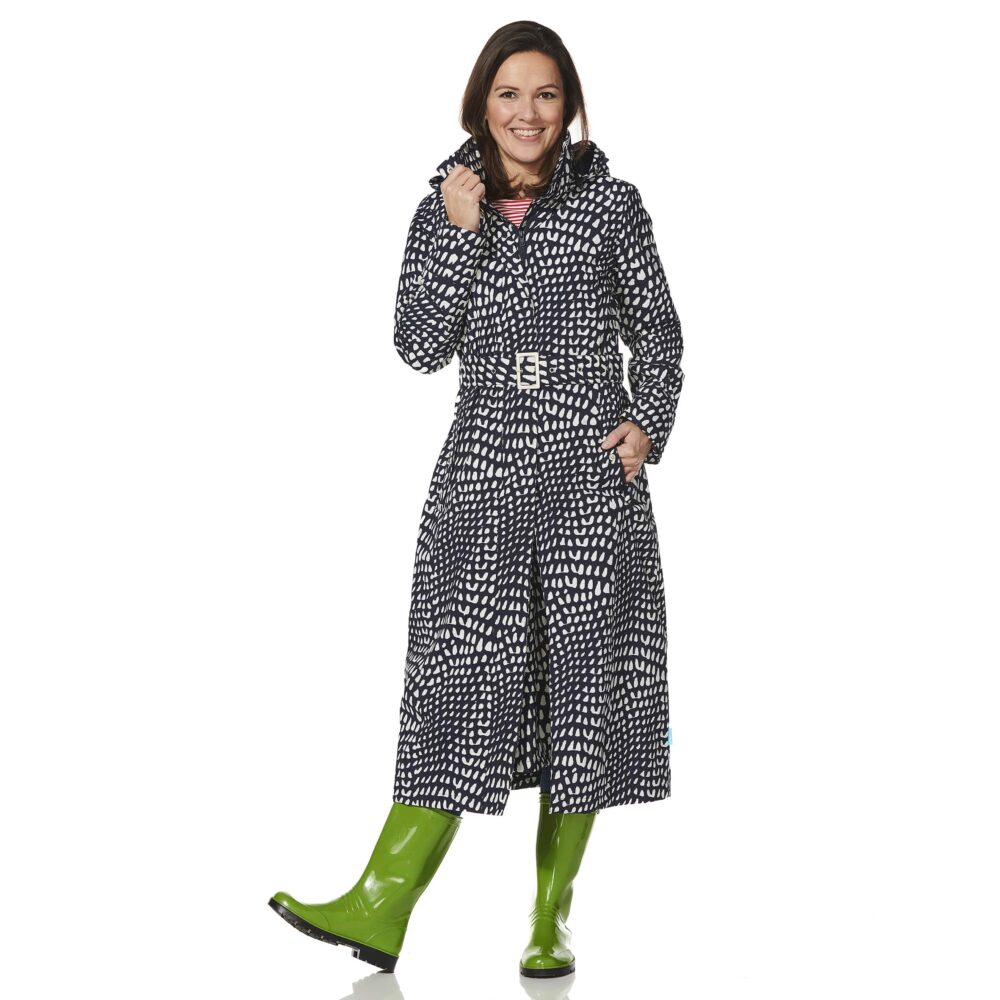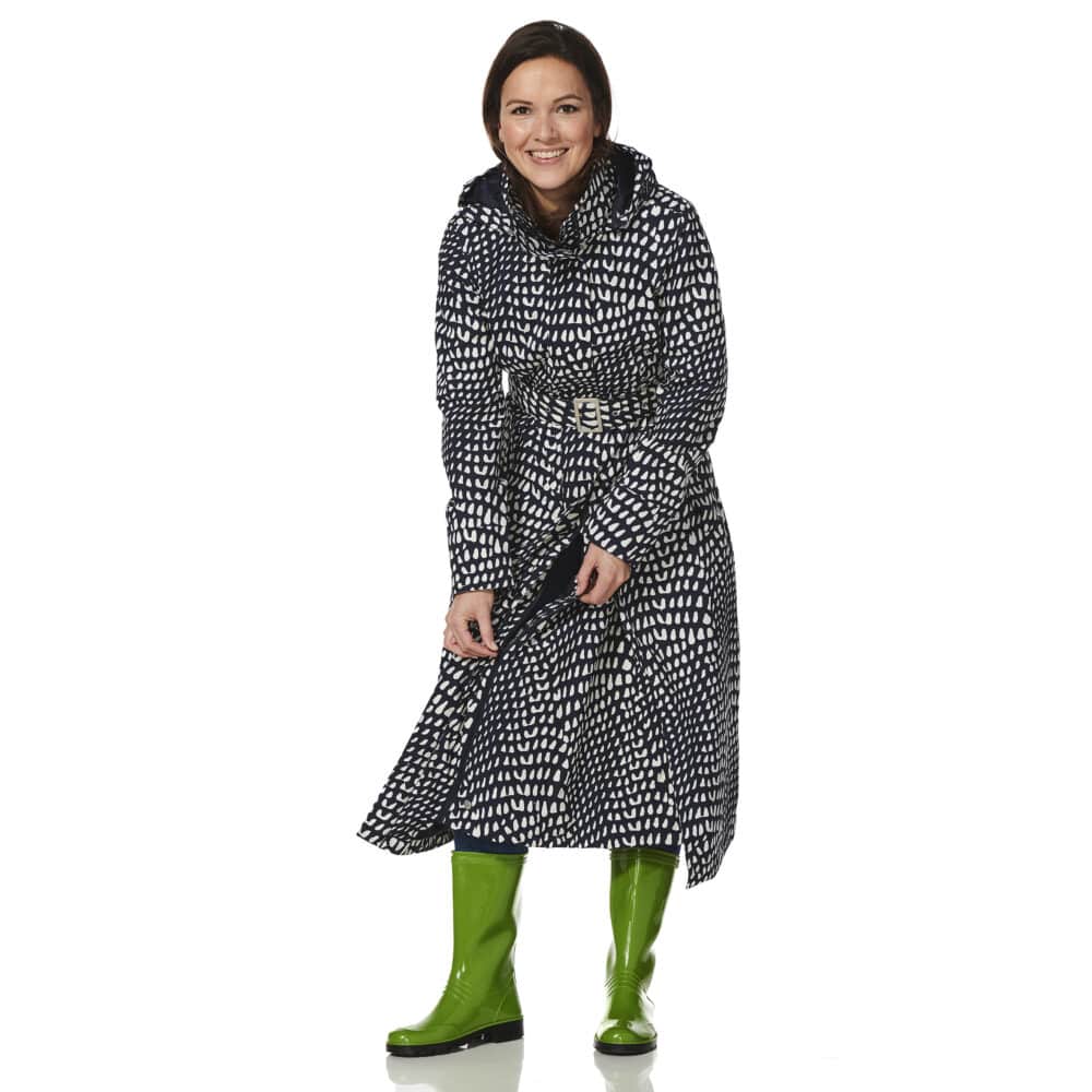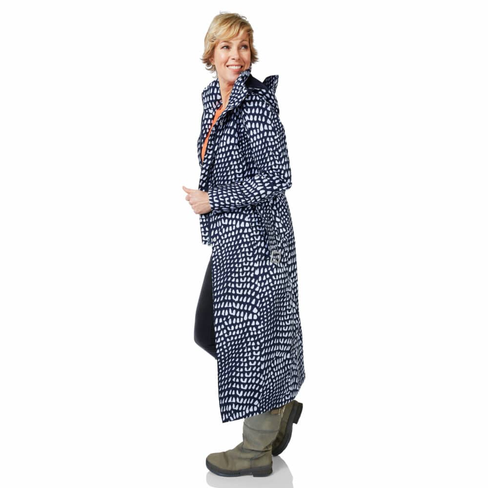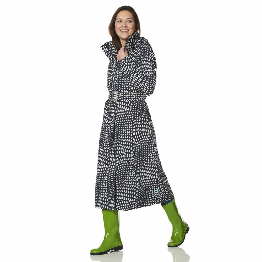 De blauw met witte print lange Montreal regenjas voor dames is het pronkstuk van HappyRainyDays. Deze blauw lange Montreal regenjas voor dames met afneembare capuchon van HappyRainyDays rijkt tot aan de enkels. Het bijzondere aan deze jas is dat hij een extra tussenstuk heeft speciaal voor op de fiets. Met deze jas heb je geen regenbroek nodig om droog te blijven op de fiets. Door de flap, die ook naar binnen geritst kan worden, heb je extra bewegingsruimte en blijven je benen droog tijdens een fietstocht of wandeling. De buitenzijde van de jas is van gecoate nylon waardoor de jas niet alleen 100% waterdicht is maar ook ademend. De binnenzijde is van 100% katoen voor het draagcomfort. Wind- en waterdicht en ademend. Kortom een unieke jas met een uitstekende pasvorm.