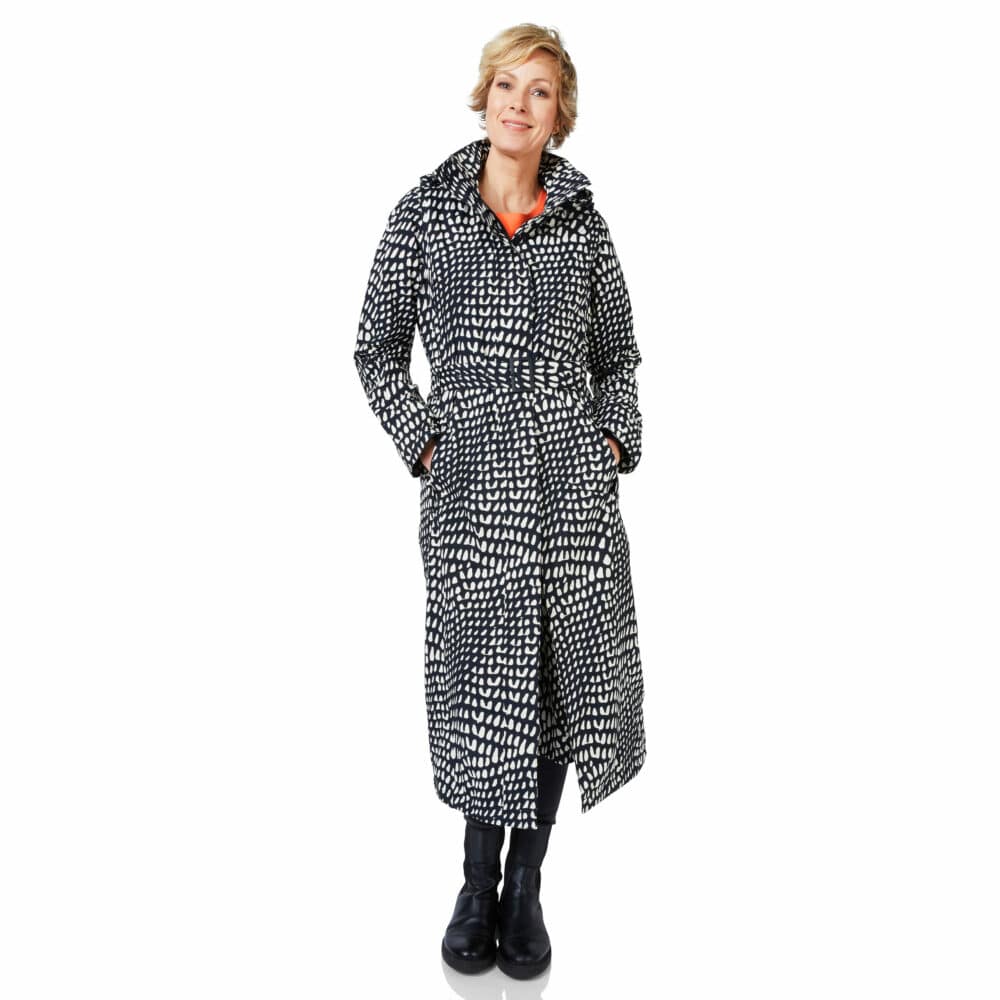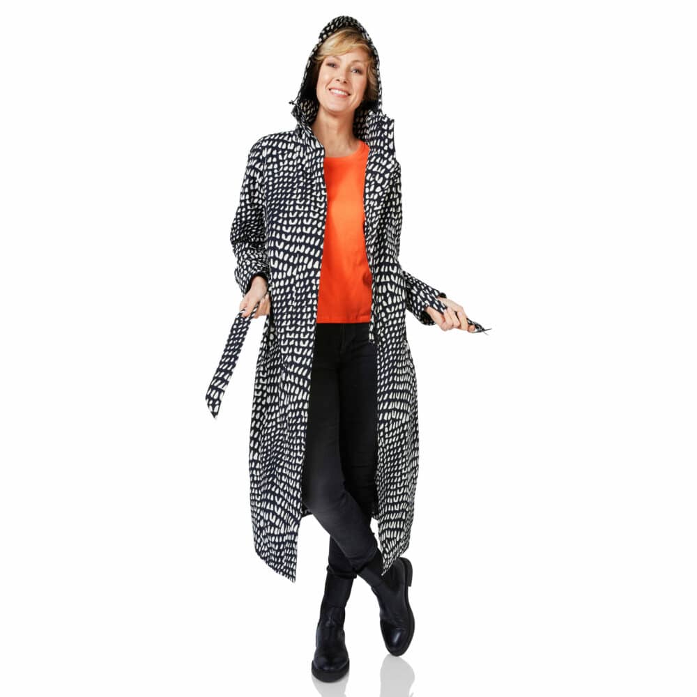 De blauw met witte print lange Montreal regenjas voor dames is het pronkstuk van HappyRainyDays. Deze blauw lange Montreal regenjas voor dames met afneembare capuchon van HappyRainyDays rijkt tot aan de enkels. Het bijzondere aan deze jas is dat hij een extra tussenstuk heeft speciaal voor op de fiets. Met deze jas heb je geen regenbroek nodig om droog te blijven op de fiets. Door de flap, die ook naar binnen geritst kan worden, heb je extra bewegingsruimte en blijven je benen droog tijdens een fietstocht of wandeling. De buitenzijde van de jas is van gecoate nylon waardoor de jas niet alleen 100% waterdicht is maar ook ademend. De binnenzijde is van 100% katoen voor het draagcomfort. Kortom een unieke jas met een uitstekende pasvorm.