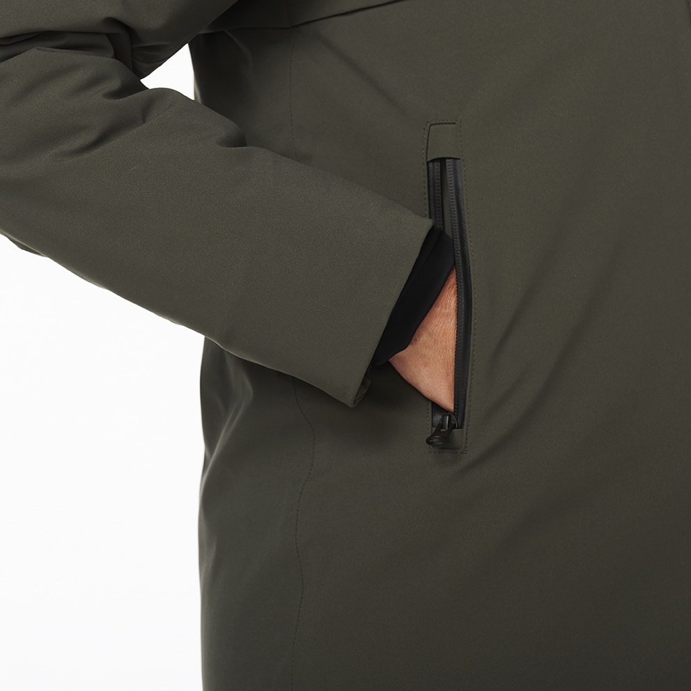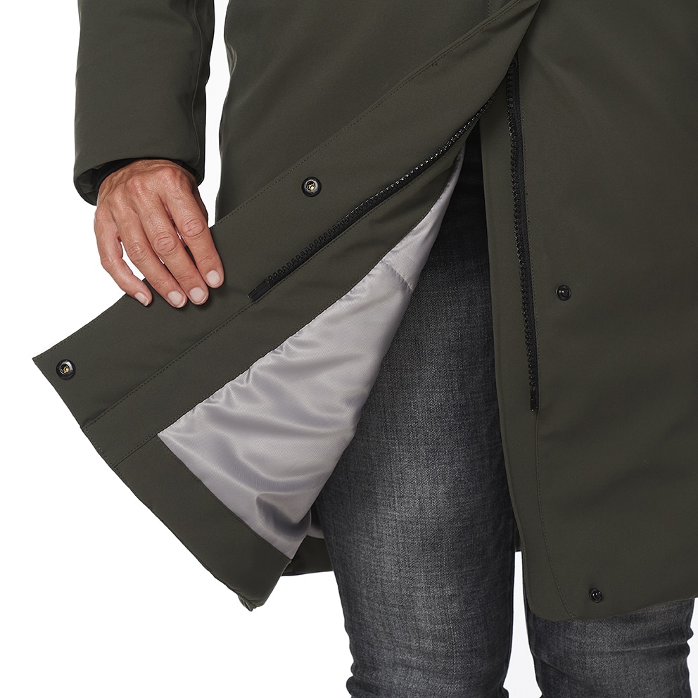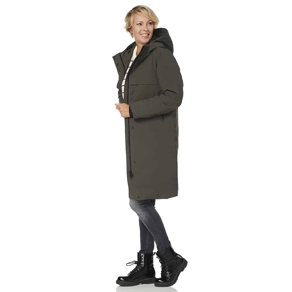 Deze olijf groene warme gewatteerde winterregenjas model Boston is een must have deze winter. Met de lengte tot op de knie en een warme thermolite wintervoering de ideale regenjas èn winterjas. De voorsluiting heeft drukkers en een 2 way rits, zodat de jas ook ideaal is voor op de fiets. De zakken hebben waterdichte ritsen. De stofkwaliteit is een PFAS vrije polyester met stretch, waardoor de jas heel comfortabel draagt. De waterdichtheid is 5000mm en ademend mvp 3000. Alle naden van de jas zijn getaped. Een ideale jas voor de koude winterse maar ook natte dagen.