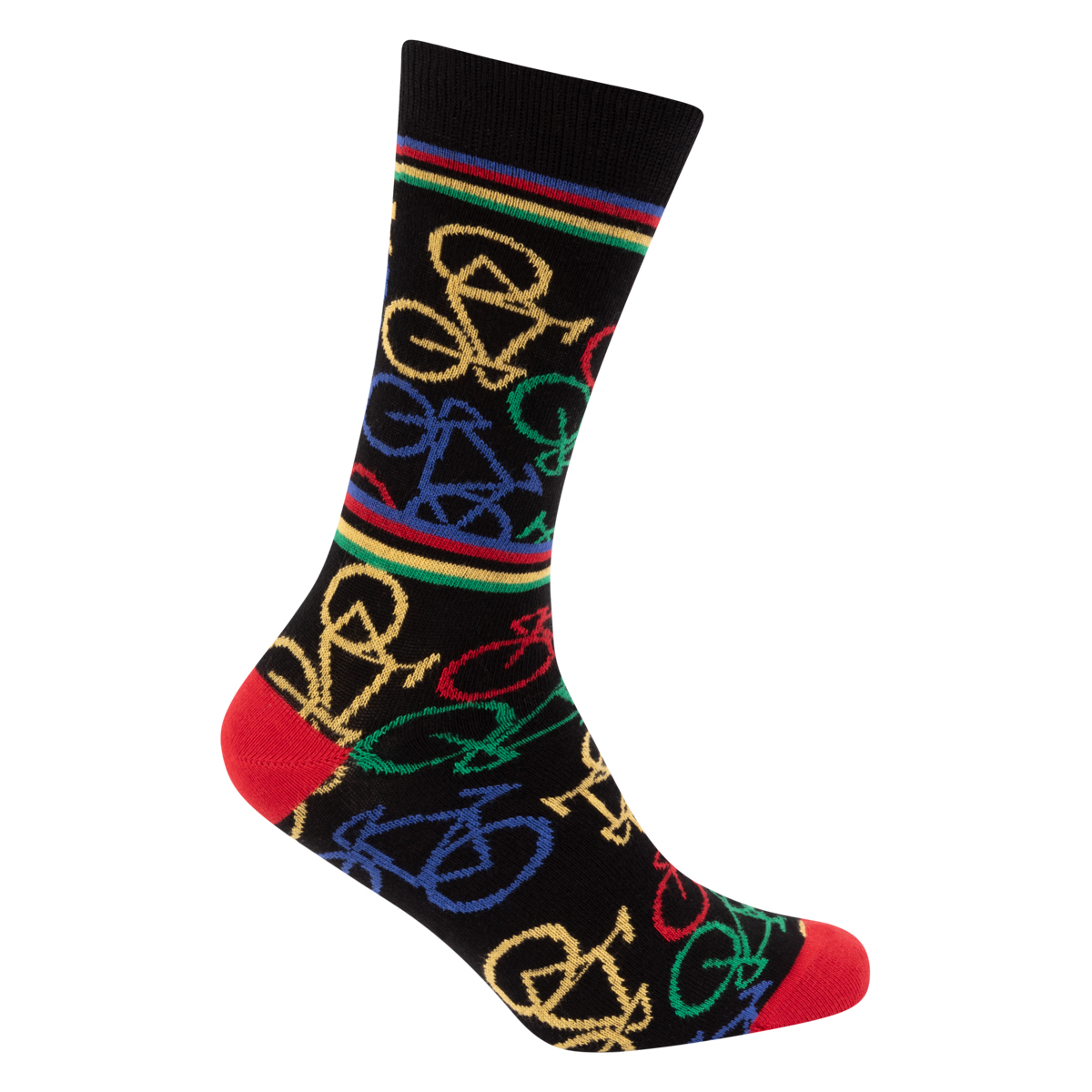 Designs in de kleuren van het WK wielrennen. Je herkent ze ongetwijfeld! Draag deze kleurige sokken onder je pak of casual outfit voor een verrassend effect. De flexibele en ademende katoen-blend zorgt voor een comfortabel en luchtig gevoel aan je voeten.